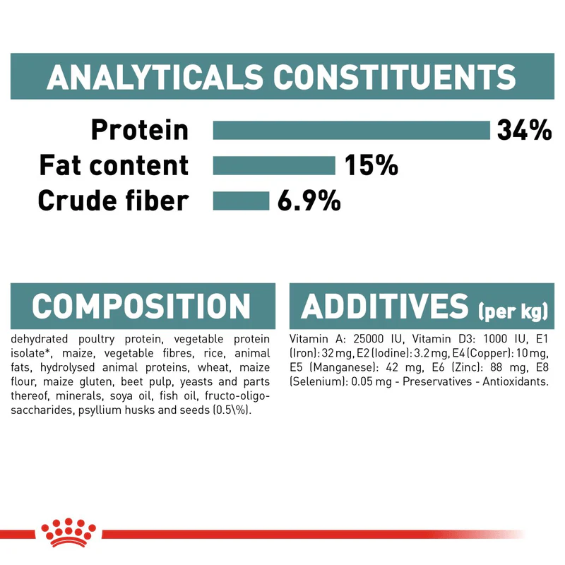 Analytical constituants: Protein: 34.0% – Fat content: 15.0% – Crude ash: 6.9% – Crude fibres: 6.9% – Total dietary fiber: 15.2%.
